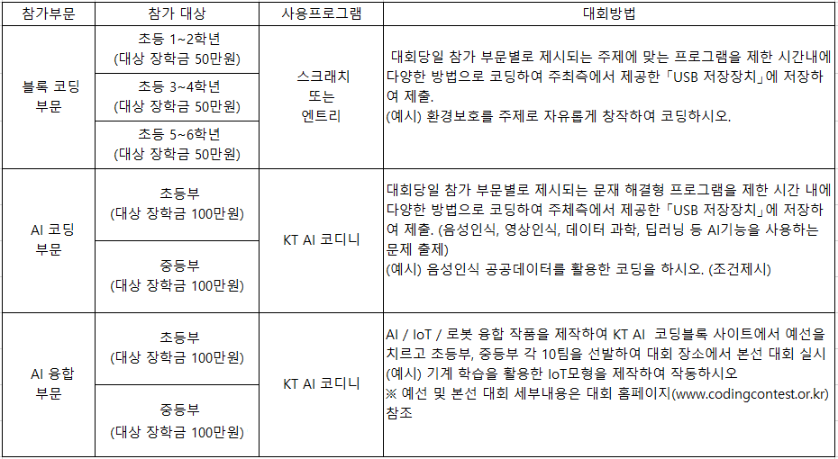 ¡á ´ëȸ¸í: Á¦5ȸ Àü±¹ Çлý ÄÚµù °æÁø´ëȸ ¡á ÁÖÃÖ: KT x Çѱ¹°æÁ¦½Å¹® ¡á ÁÖ°ü : ¢ß¿ÍÀÌÁî±³À° ¡á ÈÄ¿ø: (»ç)´ëÇѹα¹ û¼Ò³â ·Îº¿¿¬¸Í ¡á ´ëȸÀÏÀÚ: 2023³â 10¿ù 14ÀÏ Åä¿äÀÏ ¡á ´ëȸÀå¼Ò: °í·Á´ëÇб³ ¼¼Á¾Ä·ÆÛ½º ³ó½É±¹Á¦°ü (¼¼Á¾Æ¯º°ÀÚÄ¡½Ã ¼¼Á¾·Î 2511 ¼ÒÀç) ¡á Âü°¡´ë»ó: ÄÚµù°ú ÀΰøÁö´É ±â¼ú¿¡ °ü½ÉÀÌ ÀÖ´Â Àü±¹ ÃÊ∙ÁßÇлý ¡á Âü°¡ºñ: 30,000¿ø / Âü°¡ÀÚ Àü¿ø ±â³ä ¸Þ´Þ°ú AICE ÀΰøÁö´É Ȱ¿ë´É·Â Æò°¡(AICE Future 3±Þ) ´ÜÇົ ÁõÁ¤